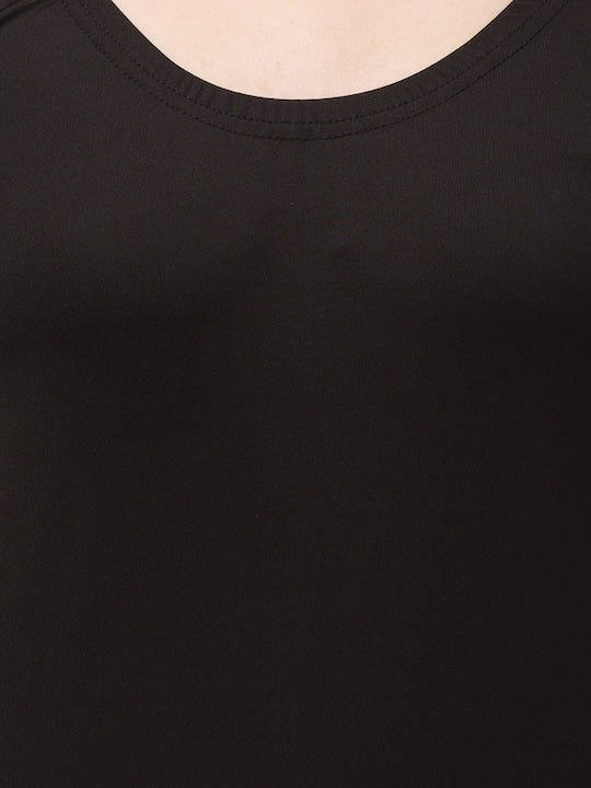 Black solid swim leg suit, has round neck and half sleeves, Slip-on Closure