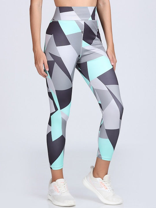 Grey and turquoise blue geometric printed ankle-length high-rise training tights has an elasticated waistband with slip-on closure