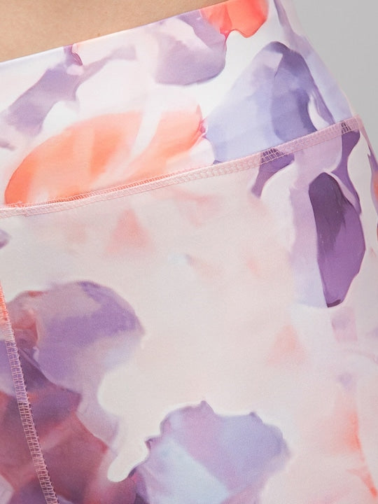 Purple, White & Peach colored printed high waist tights has an elasticated waistband with slip-on closure