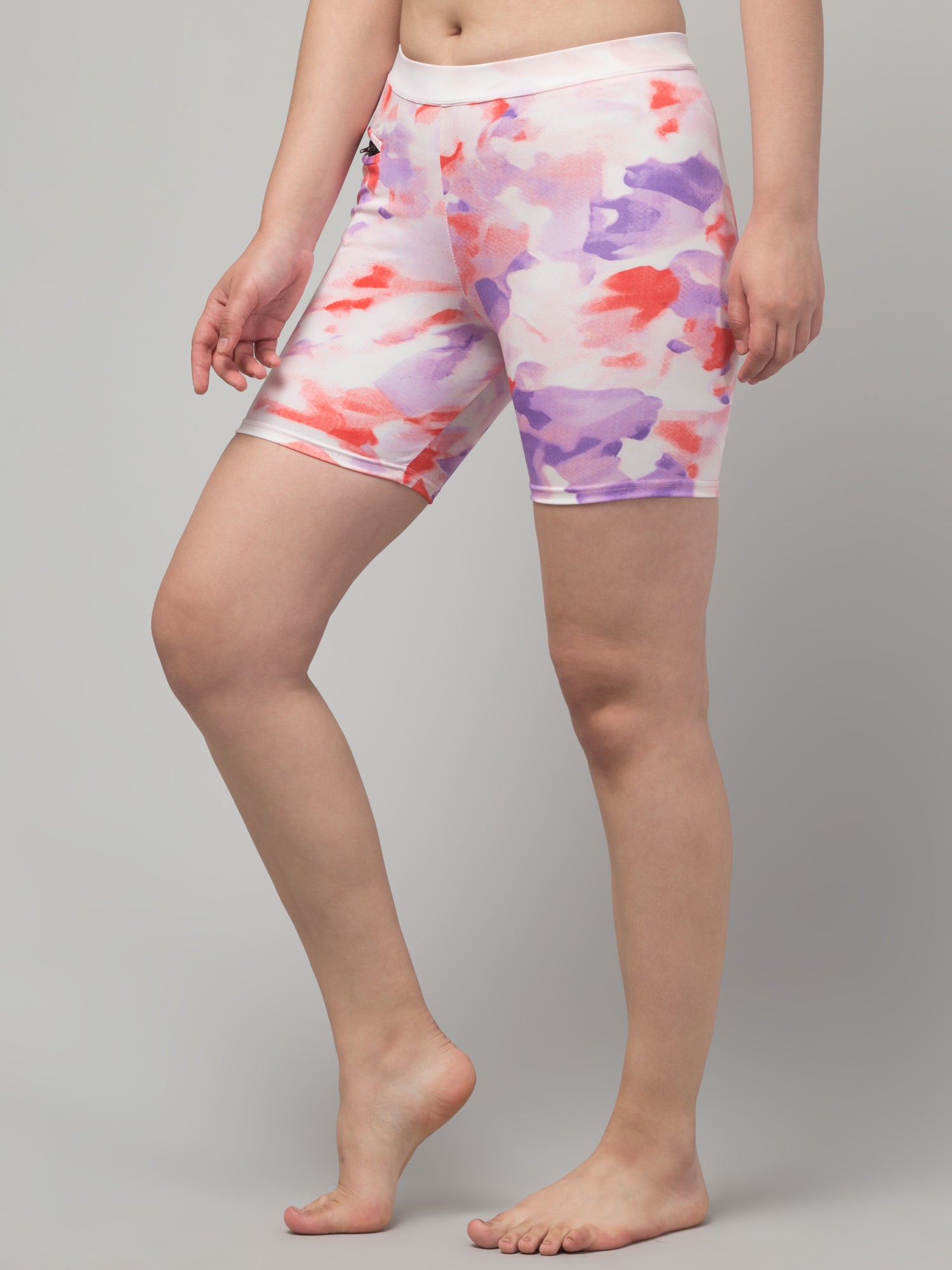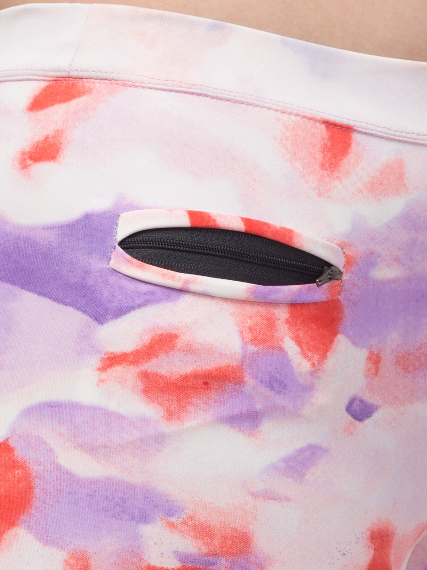 Women’s swim bike shorts in multi-color watercolor print (lilac/red/white)